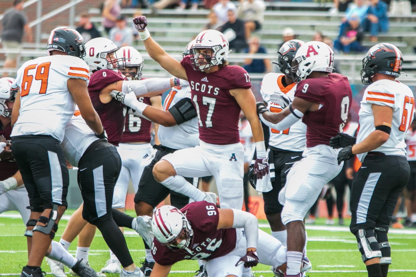 Quarterback (QB), Carter St. John (ā26), played below his standards as a top Division III QB in passing efficiency but still had a great game nonetheless. He took his chance to get in on the scoring, opening up the Scots’ first drive of the second quarter with a seven-yard touchdown rush to raise the Alma lead to 15.