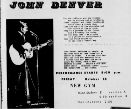 WADE FULLERTONSTAFF WRITER John Denver performance poster in the October 6, 1969 edition of the Almanian Newspaper. John Denver performs with acoustic guitar [LEFT]. His lyrics to his album Rhymes and Reasons [RIGHT] A rumor has circulated campus for far too long without a clear answer. Did John Denver perform at Alma College? Did he... Continue Reading →